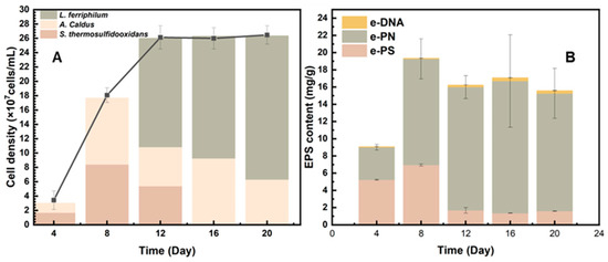 EPS was also measured as shown in Figure 6B. Extracellular proteins (e-PN) were the major components of EPS during the whole bioleaching process. Extracellular polysaccharides (e-PS) produce a large ratio during the early bioleaching period, but it decreased after 12 days. The low concentration of e-DNA indicates that the result of EPS extraction is significant.