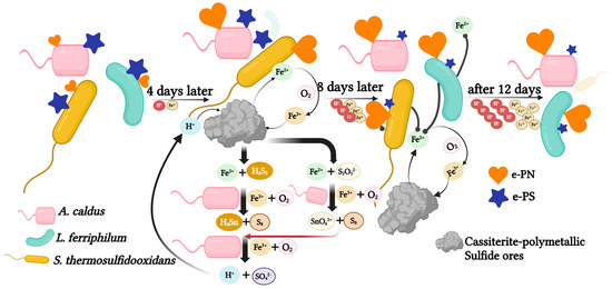 The mechanism of the mixed culture during the desulfurization of tin ore. The ratio of hearts and stars indicates the content of extracellular proteins (e-PN) and extracellular polysaccharides (e-PS), respectively. The pyrite from tin-polymetallic sulfide ores was leached with the H+, resulting in the formation of Fe2+, H2S2 and S2O32−. After 4 days of incubation, pH and Fe2+ concentrations are favorable for the growth of S. thermosulfidooxidans and A. caldus growth. As the concentration of H+ and Fe3+ increases, the cell density of L. ferriphilum increases, eventually becoming dominant. A. caldus removes elemental sulfur S0 and other sulfides enhancing the bioleaching of pyrite, therefore it persists throughout the bioleaching system. In addition, the content of e-PN increased as the concentration of H+ and Fe3+ increased while the content of e-PS decreased.