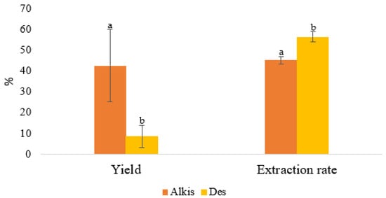 Protein yield and extraction rate obtained via the traditional method (Alkis) and deep eutectic solvent (Des). Data are presented as mean ± standard deviation (n = 3). Different letters above bars indicate statistically significant differences between extraction methods within each parameter (e.g., yield and extraction rate), as determined via one-way ANOVA followed by Tukey’s post hoc test (p < 0.05).