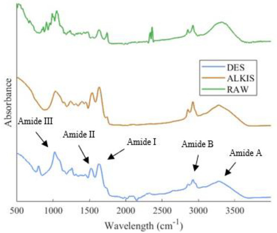 The spectral deconvolution of DES- and ALKIS-extracted proteins shows differences in secondary structure composition. Indeed, the DES-extracted protein (Figure 3a–c) exhibits a well-defined deconvolution, with a higher proportion of peaks corresponding to β-sheet structures, which preserve hydrophobic amino acids located in the interior regions of the folded proteins, while α-helix structures typically reside on the exterior of protein molecules [36]. This result may suggest that the use of strong acid/alkaline solutions could cause the unfolding of the protein and consequently a reduction in β-sheet folding. This result is supported by the fact that protein extraction via DES is associated with the presence of hydrogen bonds that may stabilize the secondary structure of the protein, protecting it from structural changes.