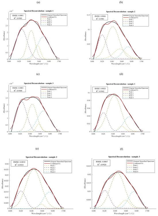 Table 2 shows the wavelength range, secondary structure, and peak number identified in the deconvoluted spectra. Figure 3 shows the deconvoluted spectra of the DES/ALKIS-extracted protein samples.