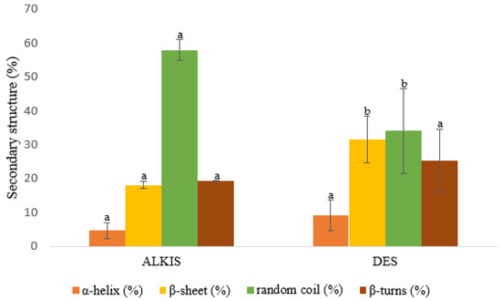 Secondary structure percentage distribution of ALKIS- and DES-extracted proteins. Data are presented as mean ± standard deviation (n = 3). Different letters above bars indicate statistically significant differences among secondary structure types between extraction methods, as determined via one-way ANOVA followed by Tukey’s post hoc test (p < 0.05).