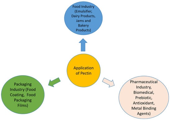 Pectin has many potential applications, from the industrial and pharmaceutical sectors to the primary food processing industries. Various applications of pectin have been demonstrated in Figure 1. The compound has gained significant importance in nutrition, food, and health sectors. Its molecular structure, comprising polar and nonpolar components, enables seamless integration into various food items [43]. Contemporary data suggests that people are more focused on healthy diets and are actively looking for feasible substitutes for petroleum-based plastic used in food packaging [44]. The edible polymers make excellent alternatives to these plastics, given their non-toxicity, environmental friendliness, and compatibility with most foods. Because of its capacity to gel and transport active substances like antimicrobials and antioxidants, pectin has justly found application in edible packaging [45,46]. Pectin is a valuable thickener [47], stabilizer [48,49,50], and emulsifier [51] in the food industry because of its multipurpose qualities. Pectin is frequently employed in jams, marmalades, and jellies because it can create a viscoelastic solution and a structural network. Pectin’s origin and the way it is processed directs particular qualities, resulting in its varied uses. For instance, in comparison to pectin from other plant fruits, apple pectin is characteristically more viscous and provides dark shades. As a result, it works better with fillings and pastries. However, compared to apple pectin, citrus pectin is lighter and a better fit as a texturing ingredient for jam and sweet jellies. So, it can be inferred that the structure of pectin can influence its use [52]. Additionally, pectin has also been shown to have biomedical and biomaterial applications. Although humans cannot digest or absorb pectin, it helps with good bacteria in the large intestine to provide prebiotic qualities [53]. Several researchers [54,55] have documented the health benefits of pectin use, which include preventing inflammatory and allergic illnesses, supporting cancer treatment, and reducing blood sugar and cholesterol levels. While numerous literature reviews cover pectin’s extraction, structural chemistry, pharmaceutical applications, and its nutritional and functional properties in food packaging [56,57,58,59,60]. The comprehensive research on greener extraction techniques and their applications remains limited. The idea behind this review is to examine almost all the emerging green technologies at one place, which has not been investigated in such a comprehensive manner previously. A comparable data has been provided for the various sources of pectin, the extraction method involved, and its physiochemical properties. A thorough description of the structural characterization visualizes the minute details of the pectin structure. Furthermore, to fill the gaps in the study of the pectin extraction and provide a different perspective for the future researchers, we have tried to present the promising features of all the sophisticated eco-friendly green techniques involved in the extraction of pectin. This review examines green extraction methodologies of pectin, their physio-chemical properties, structural characterization, and future multidisciplinary applications.