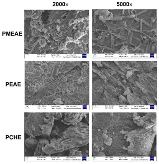 SEM images of pectin extracted from feijoa using a microwave-enzyme assisted (PMEAE), enzyme assisted (PEAE) and conventional heating methods (PCHE) [92].