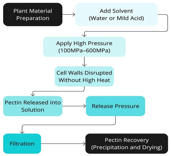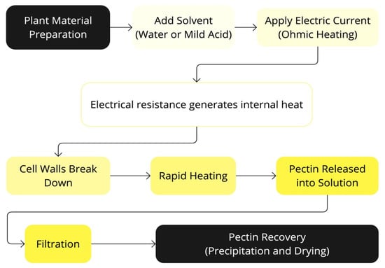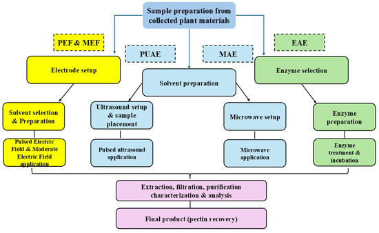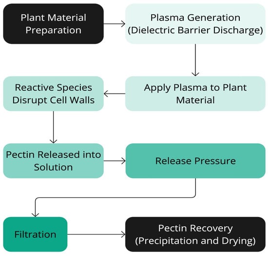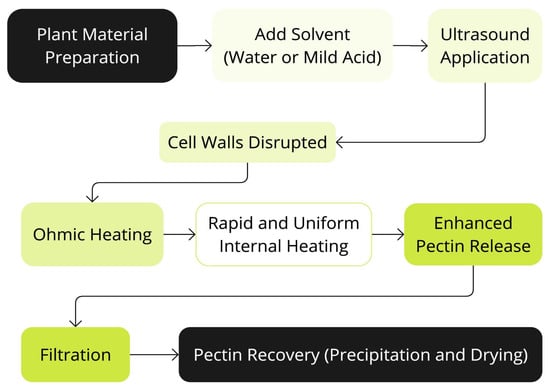 In recent years, the demand for pectin—a versatile polysaccharide widely used in food, pharmaceutical, and cosmetic industries—has surged due to its gelling, thickening, and stabilizing properties. Traditional pectin extraction methods typically rely on acid hydrolysis and extensive thermal processing, both of which consume significant amounts of energy and generate chemical waste, raising environmental and economic concerns [153]. Researchers have increasingly turned to eco-friendly extraction techniques that improve efficiency while reducing environmental impact to address these challenges. These greener methods minimize the use of harmful solvents and excessive energy consumption and maintain the extracted pectin’s structural integrity and quality. Innovations such as ultrasound-assisted extraction, pulsed ultrasound-assisted extraction, pulsed electric field, moderate electric field mediated extraction, microwave-assisted extraction, subcritical water extraction, enzyme-assisted extraction, ohmic heating-assisted extraction, ultrasound-assisted microwave extraction, ultrasound-assisted ohmic heating extraction, hydrothermal processing using water, high-pressure processing extraction, and dielectric barrier discharge extraction present promising pathways for achieving more efficient and environmentally responsible pectin production.