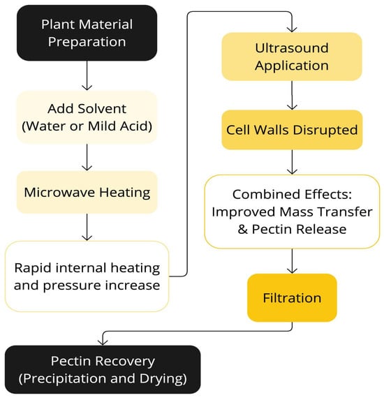 This method increases mass transfer and extraction efficiency by using ultrasonic waves. Ultrasound waves cause cavitation bubbles in the solvent to abruptly burst, releasing shock waves that degrade cell walls and facilitate extraction. The sound waves here have frequencies higher than human hearing; they usually fall between 20 and 40 kHz for pectin extraction. Ultrasound irradiation of raw materials fulfills several goals. On the one hand, ultrasonic irradiation increases cell disintegration by cavitation, exposing the cells’ inner structure to the solvent. On the other hand, sonication speeds the rehydration of dry materials, boosting solvent penetration. Nevertheless, extended ultrasonic irradiation with heat should be avoided since it may promote fast pectin degradation, resulting in a decreased yield [21,154,155,156,157,158]. Overall, the UAE mechanism maximizes mass transfer, cavitation, and cell disruption, thereby improving extraction yield and efficiency. The mechanism (Figure 5) is described as follows: