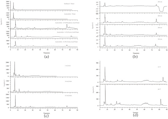 According to the relevant literature [23,24], the chromatographic conditions were optimized, including the mobile phase composition, flow rates, detection wavelength, and column temperature, as illustrated in Figure 1. Studies indicated that acetonitrile as the organic phase yielded improved chromatographic performance with more detectable peaks (Figure 1a). Among the additives tested, 0.1% formic acid provided the best baseline stability and peak separation. For detection wavelengths, 280 nm offered more detectable peaks and smoother baselines (Figure 1b). Better peak separation was achieved at a flow rate of 0.5 mL/min (Figure 1c) and a column temperature of 25 °C (Figure 1d). The elution condition was finalized through repeated experiments.
