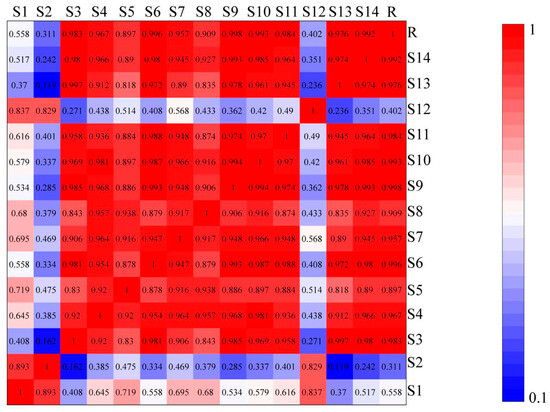 The similarity results of 14 different regions of wine-processed P. sibiricum, as analyzed in the Chinese Medicine Chromatographic Fingerprint Evaluation System software version 2004.A, are shown in Figure 4. The similarity indices for batches S3–S11, S13, and S14 exceeded 0.89, indicating high similarity. In contrast, the indices for batches S1, S2, and S12 were 0.558, 0.311, and 0.402, respectively, suggesting that the chemical constituents or contents of these batches differed notably from the control. S1 and S12 were from Hunan, and S2 from Guizhou. This variability suggests chemical composition and content differences among wine-processed P. sibiricum samples from different sources. The origin of the samples and the preparation process may contribute to these differences.