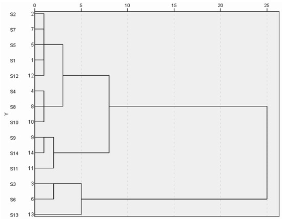 The common peak areas of 14 batches of wine-processed P. sibiricum were imported into SPSS 27.0 software for cluster analysis. This analysis was conducted using squared Euclidean distance with the inter-group linkage method. The results are shown in Figure 5. The cluster analysis revealed that at the Euclidean spacing of 6, the 14 batches of wine-processed P. sibiricum extracts could be categorized into three major groups. Specifically, batches S1, S2, S4, S5, S7, S8, S6, S10, and S12 were clustered into the first category, batches S3, S6, and S13 into the second group, and batches S7, S11, and S14 into the third group. When the Euclidean distance was set to 10, all products from Guizhou were grouped. The cluster analysis helps differentiate the origins of wine-processed P. sibiricum based on variations in quality.