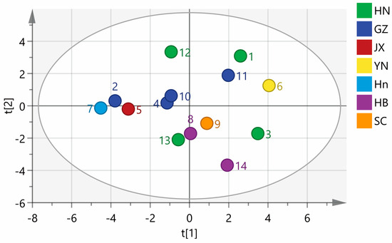 SIMCA 14.1 software was used to perform a PCA analysis of 14 batches of wine-processed P. sibiricum. A PCA matrix of size 14 × 17 was created, with the areas of 17 common peaks in the fingerprints serving as variables. This matrix was employed to plot the PCA scores for 14 batches of wine-processed P. sibiricum from various regions. As shown in Figure 6, the samples are categorized into three groups: the first group includes samples S1, S6, and S11; the second group comprises S2, S4, S5, S7, S8, S10, S12, and S13; and the third group consists of S3, S9, and S14. The rankings of the comprehensive scores were consistent with those derived from the PCA conducted using SPSS. The findings highlight the differences in quality among the wine-processed P. sibiricum from different regions. Notably, even within the same region, there are variations in quality, which may be influenced by different harvest seasons and processing conditions.