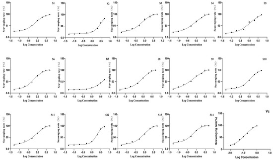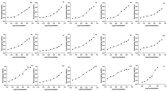 The antioxidant activity of the extracts was evaluated using DPPH and ABTS antioxidant assays, with the IC50 values presented in Table 6 and Figure 7 and Figure 8. All batches of wine-processed P. sibiricum extracts demonstrated antioxidant activities; however, the levels of these activities varied among the different batches. This variation suggested that although the chemical composition of each sample is similar, there may be significant differences in the content of specific compounds that influence the antioxidant activity. Additionally, the results obtained from the ABTS and DHHP assays were consistent in their overall trends.