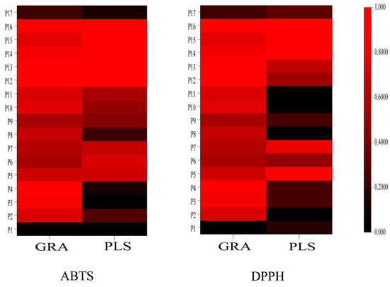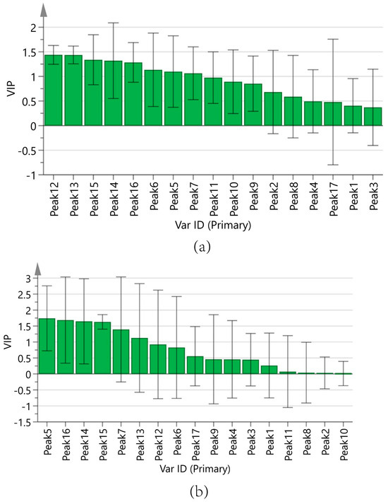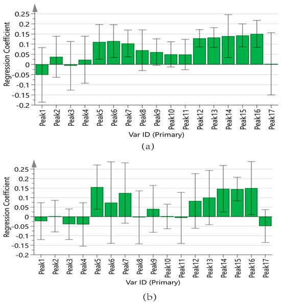 Figure 9a displays the regression coefficients of the 17 peaks with antioxidant capacity. Positive regression coefficients represent a positive correlation, and negative regression coefficients suggest a negative correlation. The VIP values are shown in Figure 10a, where VIP > 1 indicates that the components significantly affect antioxidant capacity.