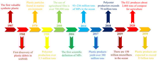 In recent decades, society’s heavy reliance on plastic products has exacerbated global plastic pollution, presenting a significant challenge in managing microplastics (MPs). Plastics are primarily used in packaging, accounting for 39.9% of total plastic usage in Europe in 2016. Plastics are extensively employed in construction (20.1%), electronics (5.7%), automotive (8.6%), and agriculture (3.4%) [1,2]. This widespread application is due to plastic’s favorable properties, including geometric stability and corrosion resistance, as well as its historical affordability. However, the extensive use of plastics has been accompanied by significant waste generation, with only a minimal fraction being recycled, and the majority ending up in landfills. The outbreak of the COVID-19 pandemic, in 2019, significantly increased the global consumption of polypropylene (PP) and polyethylene (PE)-based face masks, exacerbating the already critical issue of plastic pollution. By 2050, the plastics industry is expected to account for 20% of global oil consumption, unless current trends are reversed [3]. Plastics often take centuries or longer to decompose, posing significant environmental challenges [4]. The historical trajectory of plastic production and its unintended consequences are illustrated in Figure 1, based on the relevant information. The inception of modern plastics dates to 1907, when Leo Baekeland synthesized the first commercially viable synthetic plastic (phenolic resin) from phenol and formaldehyde [5]. Since then, global mass production has made plastics indispensable in daily life. However, the mismanagement of plastic waste has led to its accumulation in ecosystems, where it fragments into MPs—solid plastic particles typically smaller than 5 mm [6,7]. These particles, made of a mixture of polymers and functional additives, can unintentionally form when larger plastic items, such as car tires or synthetic textiles, undergo wear and tear [7]. It is also important to note that synthetic textiles are products made from synthetic fibers. The widespread use of synthetic fibers leads to the continuous release of microfibers into the environment through processes such as production and washing. These microfibers are extremely small in size (with lengths reaching up to 100 μm and diameters as small as 2 μm), presenting unique challenges for pollution management [8,9,10]. MPs are transported through various pathways, such as the atmosphere, rivers, and soil, exhibiting distinct physicochemical properties in different environments. For example, microplastics in soil can form complexes with organic matter and mineral particles, complicating their separation. This environmental behavior is further influenced by their adsorption capacity—MPs efficiently adsorb a wide range of toxins due to their minute size and high dispersion [11,12,13], which provide a large surface area and numerous adsorption sites. Additionally, the hydrophobic nature of the polymeric components in MPs further enhances this process [14]. With advancing knowledge of microplastic migration and transformation, researchers can develop targeted separation techniques based on pathway-specific characteristics, which is critical for assessing their risks to ecosystems and human health.