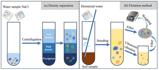 Zhang et al. [124] developed a flotation-based method for extracting MPs from soil samples, as illustrated in Figure 3b. The method is mainly based on flotation and ultrasound-assisted separation. Specifically, 10 g of soil was mixed with 50 mL of distilled water in an aluminum cup and manually stirred to form a homogeneous suspension. After rinsing the glass rod with distilled water, the mixture is left overnight to allow soil particles to settle. Floating MPs and surface impurities are then decanted and filtered through 3 μm pore-size filter paper. This step is repeated at least four times to ensure complete extraction. The soil solution is further subjected to ultrasonic vibration for 2 h to enhance microplastic detachment from soil particles, followed by additional filtration. The filter, along with the collected material, is oven-dried at 60 °C to a constant weight for quantification. However, MPs strongly adhere to soil particles, making extraction via flotation challenging [124].