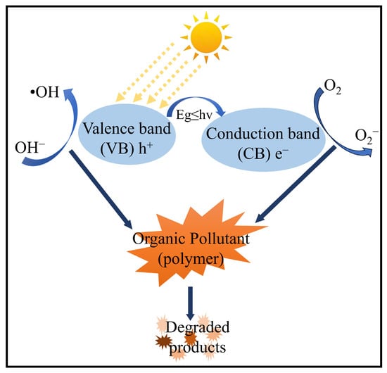 Photocatalysis, as shown in Figure 5, is a process that accelerates reactions via active sites generated on the catalyst surface by light energy, without the need for direct contact with the catalyst [137]. Photocatalytic degradation involves redox processes, such as superoxide radicals (O2·) and hydroxyl radicals (·OH), which react with organic polymers, leading to their decomposition, polymer chain breakage, and potential mineralization [138,139]. While photocatalytic degradation offers the advantage of not requiring additional chemical substances besides stable photocatalysts, its widespread application is hindered by limitations such as inadequate selectivity for MPs, difficulty in catalyst regeneration, and varying degradation efficiency [140]. In another study, organic solvents were used to mix polymers with TiO2 to form composite films, and TiO2 was embedded into PE, PS, and PP plastics for photocatalytic treatment [141,142]. Tofa et al. [143] employed ZnO nanorods and ZnO nanorods decorated with Pt nanoparticles for photocatalytic degradation of low-density polyethylene (LDPE) in water. After photocatalysis, surface wrinkling, cracking, and cavities were observed on the polymer surface due to the formation of oxygen-containing groups and volatile organic compounds, validating the chemical conversion of the polymer. Chen et al. [144] induced aging and degradation of MPs using electron beam technology, resulting in carbon chain breakage due to hydroxyl radicals generated by electron beam radiation. This process gradually degraded the MPs into small molecule esters and alcohols. It was found that the oxygen-to-carbon ratio of aged MPs reached 0.071, with a mass loss of 48%, and a carbonyl index value of 0.69. Chokejaroenrat et al. [145] deposited CuO onto BiVO4 nanocomposites and found improved photocatalytic activity, increasing the generation of ROS from e-h pairs. After incineration with H2O, ROS generation further escalated, causing significant surface wear and an elevation in carbon-based and vinyl indices in MPs. Jiang et al. [146] found the outstanding degradation performance of MPs using a novel quaternary layered double hydroxide composite photocatalyst, CuMgAlTi-R400. Following 300 h of illumination, an average particle size reduction of 54.2% was achieved, with higher degradation efficiency correlating with smaller particle sizes. Xue et al. [147] studied a visible light-driven catalytic and photothermal Fenton-like reaction method, revealing that, without external H2O2 dosage, the degradation rate of 310 nm PS spheres approached 100% after 4 h at 75 °C under visible light irradiation.