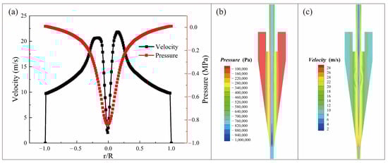 Hydrocyclone’s distribution of total pressure and total velocity: (a) numerical values; (b) pressure contour; (c) velocity contour.