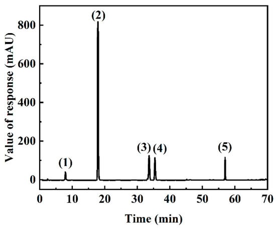 The chromatographic characterization of SMYAD was conducted using a Hitachi PM1000 HPLC platform (Hitachi Limited, Tokyo, Japan) equipped with a quaternary solvent delivery system, automated sample injector, and ultraviolet detection unit. Compound separation was accomplished on a thermostatically controlled (38 °C) Kromasil C18 analytical column (250 × 4.6 mm, 5 µm particle size). The elution process employed a binary solvent system consisting of acetonitrile (mobile phase A) and 0.4% phosphoric acid aqueous solution (v/v, mobile phase B), maintained at a constant flow rate of 1 mL/min with programmed gradient conditions (Table 2). Detection parameters included 210 nm wavelength and 10 µL injection volume. As shown in Figure 1, reference compounds exhibited distinct retention times: harpagide (7.887 min), chlorogenic acid (17.847 min), ferulic acid (33.560 min), liquiritin (35.360 min), and harpagoside (56.900 min). External standard calibration curves demonstrated excellent linearity (R2 ≥ 0.9996) across 0.0016–1.46 mg/mL, with regression equations as follows: ychl = 1 × 107x + 202,131 (R2 = 0.9997), yfer = 5 × 107x − 82,958 (R2 = 0.9998), yliq = 6 × 106x − 31,397 (R2 = 0.9999), yhgi = 2 × 106x − 9692 (R2 = 0.9999), and yhgo = 1 × 107x − 31,276 (R2 = 0.9996). In the established calibration model, y represents the chromatographic peak area of the target compound, while x denotes the corresponding concentration (mg/mL) for each of the five analytes.