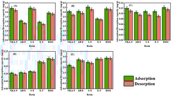 Static adsorption–desorption of harpagide (A), chlorogenic acid (B), ferulic acid (C), liquiritin (D), and harpagoside (E) on five resins.