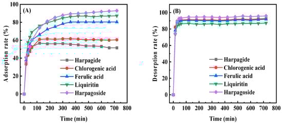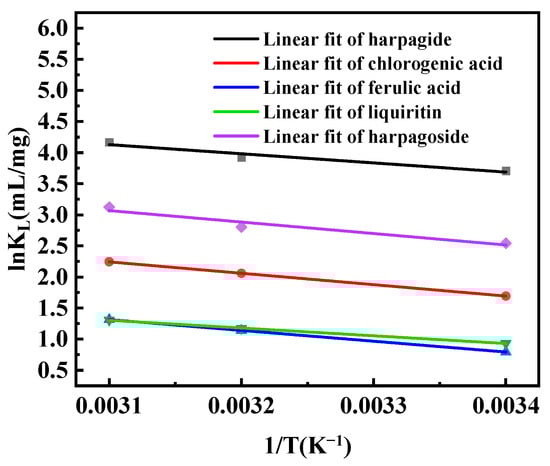 Thermodynamic analysis utilizing the Langmuir equilibrium constant (KL) revealed exothermic adsorption characteristics for all five components, as depicted in Figure 6. The linear regression coefficients (R2) were determined as follows: harpagide (0.9485), chlorogenic acid (0.9999), ferulic acid (1), liquiritin (0.9990), and harpagoside (0.9385). Calculated adsorption heats (Q) derived from Equation (9) were −12.2274, −15.2479, −14.4414, −10.3567, and −15.3451 kJ/mol for respective components. Q is less than 0, indicating exothermic adsorption; all below the 43 kJ/mol threshold indicate physical adsorption processes [24,26].