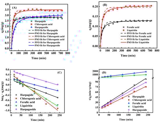 Adsorption kinetic curves of SMYAD on the D101 resin, (A,B). The linear correlations based on PFO (C) and PSO (D).