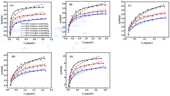 In this context, qm represents the theoretical maximum adsorption capacity (mg/g), while Ce indicates the equilibrium concentration in solution (mg/mL). The model parameters include KL (Langmuir equilibrium constant), KF (Freundlich capacity coefficient), and 1/n (heterogeneity factor characterizing adsorption site energy distribution) [31,32,33,34,35].