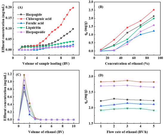 Figure 7A illustrates that chlorogenic acid, liquiritin, and harpagide exhibited initial leakage, whereas ferulic acid and harpagoside remained retained. The leakage point is operationally defined as the effluent index component concentration reaching 10% of its corresponding loading solution concentration. At 6 BV outflow volume, chlorogenic acid concentration in the effluent measured 0.07 mg/mL, approximating 10% of its loading solution concentration (0.7 mg/mL), thereby constituting the leakage threshold. Concurrently, the remaining four index components demonstrated marked leakage. Consequently, 6 BV was empirically established as the optimal loading volume for D101 macroporous resin.