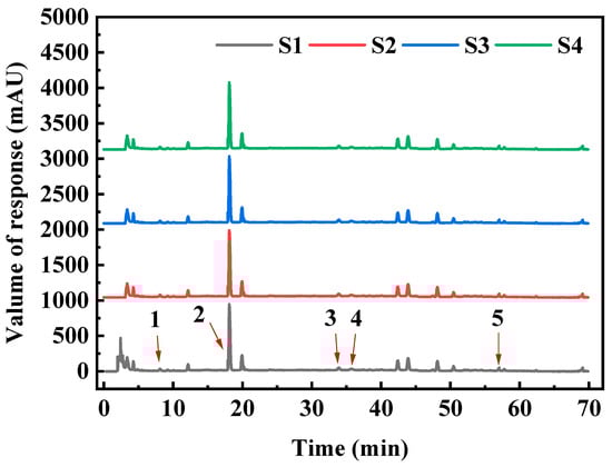 SMYAD fingerprint chromatogram. 1-Harpagide, 2-Chlorogenic acid, 3-Ferulic acid, 4-Liquiritin, and 5-Harpagoside. S1 represents the crude SMYAD extract, while S2–S4 denote the purified SMYAD.