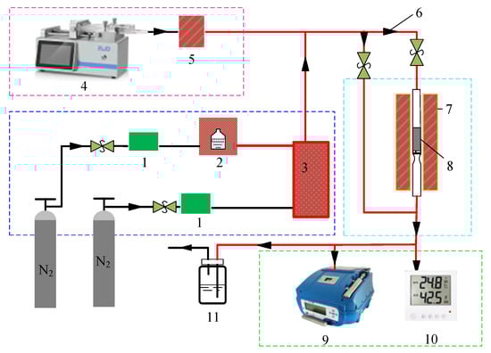 Diagram of dynamic adsorption device (1. Mass flow controller, 2. VOC generator, 3. Mixer, 4. Microinjection pump, 5. Heater, 6. Heat tapes, 7. Fixed-bed tube furnace, 8. Adsorbent, 9. Non-methane total hydrocarbon analyzer, 10. Temperature and humidity sensor, 11. Absorption bottle).