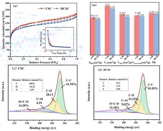 N2 adsorption–desorption isotherms at 77 K and HK pore-size distribution (a), textural parameters (b), XPS spectra of C1 peaks of samples: (c) CSC, (d) HCSC.
