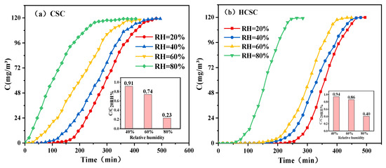 Toluene was used as the adsorbate to investigate the effect of the adsorbent polarity. Figure 3 shows the toluene breakthrough curves on CSC and HCSC under varying humidity conditions with 0.5 g adsorbent loading. With increasing relative humidity, toluene adsorption is increasingly affected. At 60 RH%, the adsorption capacity of toluene significantly decreased. Compared to 20 RH%, the adsorption capacity decreased 17% on CSC and 8% on HCSC. At 80 RH%, the decreases were 68% and 54%, respectively. The heat-treated HCSC with low polarity outperformed the pristine activated carbon (CSC) in toluene adsorption under different humidities, exhibiting greater toluene/water vapor selectivity. Compared to the other reported adsorbents, HCSC also showed excellent water resistance in the process of toluene adsorption, as listed in Table 1.