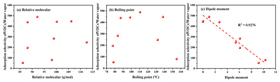 To further elucidate the relationship between molecular polarity and adsorption selectivity, single-component constant-pressure adsorption experiments were conducted using eight VOCs with varying polarities on an activated carbon model with a surface oxidation degree similar to HCSC. The VOC adsorption capacity and average isosteric heat of adsorption were determined. Combined with the obtained water adsorption capacity and isosteric heat of adsorption, the VOC/water vapor adsorption selectivity at 70 RH% was calculated using the DIH equation [36] (Table 5). The relationship between VOC molecular properties (molecular mass, boiling point, and dipole moment) and adsorption selectivity was further analyzed and is presented in Figure 7. No significant correlation was observed between VOC molecular mass, boiling point, and adsorption selectivity. Previous studies have indicated that adsorbates with a larger molecular mass and higher boiling point exhibit a greater adsorption capacity due to increased interaction within pores of activated carbon [37]. However, this observation primarily applies to dry conditions and is not applicable to high-humidity VOC adsorption. A strong negative correlation was observed between dipole moment and adsorption selectivity (R2 = 0.9276). Adsorption selectivity decreased with increasing dipole moment, which is because at a low VOC concentration, surface chemistry plays a more important role in adsorption. The relatively low carboxyl group content and thus nonpolar nature of the AC leads to unfavorable adsorption for strongly polar VOCs. Furthermore, as illustrated in Figure 8, strongly polar VOCs preferentially adsorb near polar oxygen-containing functional groups, leading to competition between adsorption sites and water molecules. The water clusters formed via hydrogen bonding under high-humidity environments, resulting in a larger negative effect. Therefore, the adsorption selectivity decreases with increasing VOC polarity.