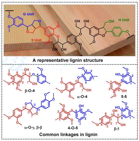The chemical structure of lignin is relatively intricate and varies according to its source and purification method, rendering its precise structure elusive []. Faix et al. proposed an approximate empirical chemical formula for lignin [], indicating an elemental composition of approximately 63.4% carbon, 30% oxygen, and 5.9% hydrogen []. Lignin is commonly envisioned as a three-dimensional highly branched amorphous phenolic polymer with a disordered reticular structure [,]. It can be rationalized into three primary phenylpropane structural units, namely p-coumarol alcohol, coniferyl alcohol, and sinapyl alcohol [], corresponding to p-hydroxyphenyl (H), guaiacyl (G), and syringyl (S) structural units [], respectively (Figure 1). These units are interconnected through various C-C and C-O bonds, predominantly β-O-4, β-β, β-5, 4-O-5, and 5-5. Among these, β-O-4 bonds usually occupy the major portion of the lignin structure []. In addition, a range of oxygen-containing groups such as methoxy, hydroxyl, and carbonyl groups exist in the C-α and C-β bonds of lignin, contributing to its complex structure []. The proportion of H, G, and S units varies based on the tree species [,]. Depending on the source, lignin can be broadly classified into hardwood lignin (HL), softwood lignin (SL), and grass lignin (GL). Among them, HL primarily consists of S and G units, SL comprises G units and some S and H units, and GL includes p-coumaric and ferulic acid in addition to S, G, and H units []. Due to its intricate structure, the high-value utilization of lignin poses a significant challenge.