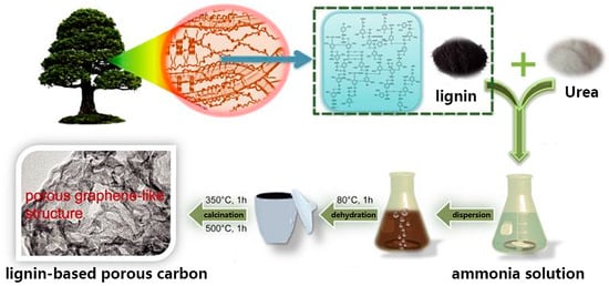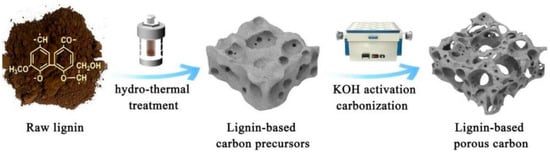 Lignin-derived porous carbon materials have received widespread attention in recent years. When converted into a porous carbon material, lignin exhibits unparalleled advantages over other biomass resources such as cellulose, polysaccharides, and proteins. Lignin-based porous carbon has the advantages of high porosity, large specific surface area, low density, good chemical stability, and regenerability, which have made it the focus of extensive research in the field of adsorption in recent years [,,].