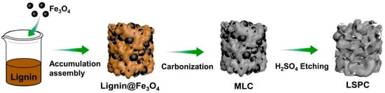 Process route for the preparation of lignin-based sulfonated porous carbon (LSPC) using the H2SO4 etching process by lignin combined with Fe3O4 [].