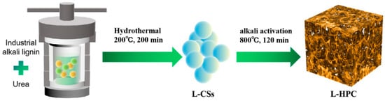 Process route for the synthesis of lignin-based layered porous carbon (L-HPC) by industrial lignin alkali doped with urea [].