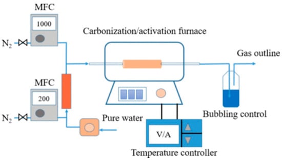 In 2024, Cao et al. prepared a series of lignin-based activated carbons using both physical and chemical activation techniques. For physical activation, steam was used to heat the water, with the temperature controlled between 700 and 900 °C. The sample was placed inside the reactor and subjected to a reaction time of 30–120 min. For chemical activation, coir or lignin was immersed in either K2CO3 or KOH solution and subsequently dried at 105 °C for 24 h. The heating process was conducted at a rate of 10 °C/min, reaching 800 °C under a nitrogen atmosphere for 40 min in a tube furnace. After cooling to room temperature, the sample was washed with distilled water until a neutral pH was achieved. Finally, the lignin-based activated carbon material was obtained by drying at 105 °C for 24 h (Figure 7) []. During the physical activation process, the specific surface area exhibited an increase followed by a decrease with the gradual increase in the temperature, reaching a maximum of 1065 m2/g at 800 °C. Similarly, in the chemical activation process, both chemical activators reached a maximal specific surface area at 800 °C. Although an increase in temperature led to a gradual decrease in the yield of lignin-based activated carbon, it significantly enhanced the specific surface area, promoting the formation of micropores. The FTIR and adsorption results showed that the lignin-based activated carbon activated by K2CO3 exhibited the best performance. During the process of K2CO3 activation, abundant micropores and oxygen-containing functional groups were formed, providing more adsorption sites and improving the adsorption performance. The adsorption efficiency of the samples increased significantly within 10 min, basically reaching equilibrium at 40 min, with a maximum adsorption efficiency of 98.22% at 60 min. After three cycles, the adsorption rate still remained above 93%, and the adsorption kinetics aligned with the proposed one-stage kinetic model.