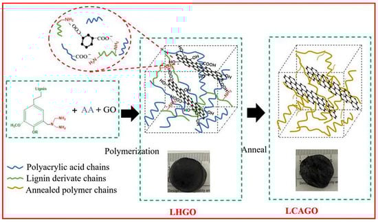 In the same year, Meng et al. used diethylenetriamine (DETA) to modify alkali lignin (AL), resulting in the formation of aminated lignin. This aminated lignin, along with N, N′-methylenebisacrylamide (MBA), and acrylic acid (AA), was dissolved in a graphene oxide (GO) solution. Ammonium persulfate (APS) was then added, and the mixture was transferred to a reaction flask, which was sealed with nitrogen and maintained at 50 °C for 12 h. This process led to the formation of graphene oxide-reinforced lignin-based hydrogel (LHGO). The hydrogel was subsequently immersed in deionized water for 72 h and freeze-dried. Lignin-based carbon aerogel (LCAGO) was obtained after annealing in a tube furnace under a nitrogen atmosphere, with a heating rate of 5 °C/min at 350 °C for 2 h (Figure 10) []. FTIR analysis revealed that, after annealing, the hydrophilic groups underwent rearrangement into aromatic and aliphatic carbon chains, transforming from hydrophilic to hydrophobic. The rough surface of the annealed LCAGO is suitable for hydrophobic applications with water contact angles up to 150°. The authors then performed water–oil separation tests, and the data showed that LCAGO exhibited moderate adsorption capacities of 32.5 g/g and 34 g/g for light and heavy oils, respectively, when compared to previous reports.