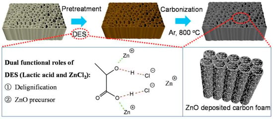 Schematic diagram of lignin-based carbon foams prepared with deep eutectic solvent (DES)-deposited ZnO [].