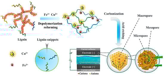 In the same year, Li et al. added polyvinylpyrrolidone (PVP) to degraded lignin, and the mixture was stirred for 10 min and dried under vacuum at 80 °C for 12 h. Subsequently, the material was heated in a tube furnace for 2 h at 800 °C under a nitrogen atmosphere, with a heating rate of 5 °C/min. After cooling to room temperature, the material was soaked in 3 M hydrochloric acid solution overnight, washed with deionized water, and dried under vacuum at 80 °C. (Figure 13) []. Using undegraded lignin as a control, the authors discovered that the material prepared using degraded lignin possessed a larger specific surface area and a hierarchical porous structure, which provided more active sites for adsorption. The prepared material exhibited excellent adsorption performance (30.2 mg/g) and retained 94.4% of the adsorption capacity after 30 electrosorption cycles. The incorporation of PVP played a crucial role in altering the structure of the material, acting as a network template that facilitated the distribution of depolymerized lignin. The reintegration of depolymerized lignin fragments with different structures during the carbonization process readily formed a pore-rich carbon material.