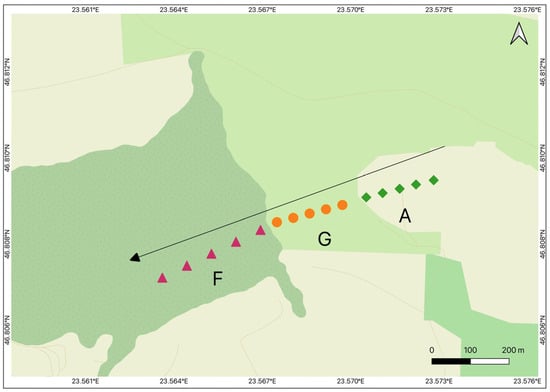 Map of the sampling points along a land use transect. F—forest; G—grassland; A—agricultural land.