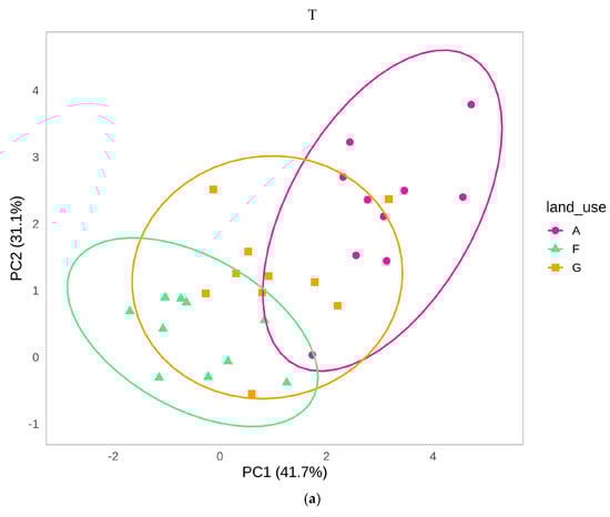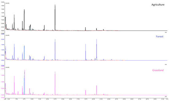 An HS-SPME/GC–MS system was used to acquire the chromatograms of the soil volatilome profiles from different land uses, i.e., forest (F), grassland (G), and agricultural land (A), as displayed in Figure 2. Analyzing this overview of representative total ion chromatograms (TICs) for each land use, it was possible to note peaks of higher intensity in the region of the first section of the TIC, with a retention time (tR) of 10 min, followed by the second section, which was between tR values of 10 and 20 min. In the last section, fewer peaks were obtained (tR) between 20 and 33 min (Table S2).