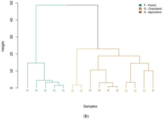 The HCA dendrogram (Figure 3b) further corroborates these findings, showing the apparent clustering of samples by land use. Samples from the same land use category tend to cluster together, underscoring the significant influence of land use on their volatilome profiles. Forest soils form tight clusters, indicating high internal similarity within this category. Grassland soil also clusters together but exhibits slightly more significant variability. The agricultural samples formed distinct clusters that were clearly separate from those in the other two categories. The branch heights in the dendrogram reflect the level of dissimilarity between clusters, with shorter branches indicating more remarkable similarity. The PCA and HCA analyses provide robust evidence that land use significantly shapes the volatilome profiles, but distinct compositional characteristics were also observed for each land use type.