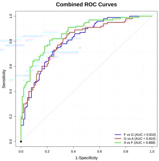 The fact that all the models significantly surpass this threshold confirms their effectiveness in discriminating between the different classes. The highest AUC values align with the clear separation observed in the PLS-DA plot. Notably, the A vs. F curve consistently maintains higher true positive rates over a range of false positive rates, emphasizing its optimal sensitivity–specificity balance under various threshold conditions.