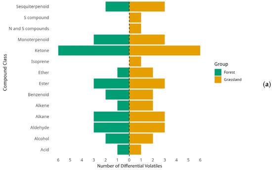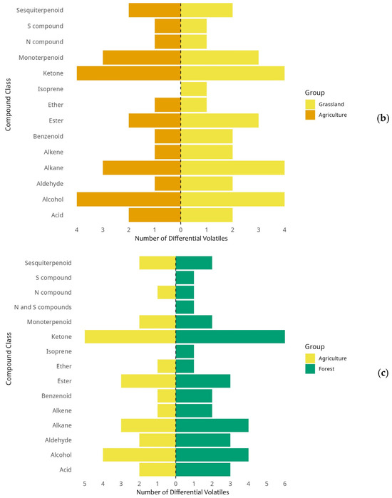 Number of differential volatile organic compounds found in each comparison. (a) Forest vs. grassland; (b) grassland vs. agriculture; (c) agriculture vs. forest.