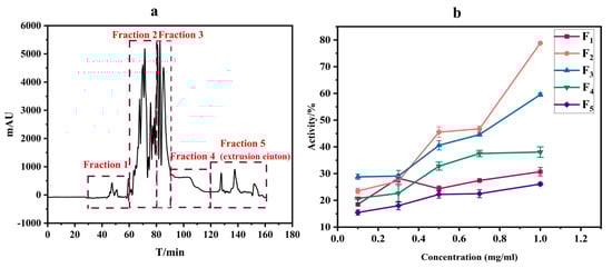 In this study, the crude extract was subjected to separation using an equal-volume solvent system comprising water, methanol, n-hexane, and ethyl acetate (1:1:1:1, v/v/v/v). The strategic advantage of this approach lies in its harmonization of solvent polarity gradients and density disparities, aiming to achieve multi-component fractionation. Under isovolumetric conditions, water (high polarity) and methanol (moderate polarity) synergistically formed a miscible layer capable of dissolving polar constituents such as glycosides and alkaloids. Concurrently, n-hexane (non-polar) and ethyl acetate (moderate-to-low polarity) selectively partitioned lipophilic compounds (e.g., terpenoids and phytosterols) through stratified extraction. This solvent ratio effectively mitigated cross-contamination risks arising from polarity overlaps, which often occurs when a single solvent predominates in conventional systems. According to the HSCCC separation results, the extract fractions were divided into five parts. The separation results are shown in Figure 1a. By measuring the activity of the five fractions at the same concentration, the activity increased gradually with the increase in the final concentration of the fractions (0.1–1 mg/mL), among which the inhibition rate of compound 2 was higher; the result is shown in Figure 1b. The IC50 value was measured as 0.56 ± 0.03 mg/mL. Therefore, fraction 2 may contain potential inhibitors, which will be used as the object of further study.