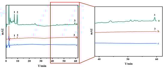 One of the advantages of HSCCC over solid–liquid chromatography is that it can achieve large preparation volumes. Increasing the injection volume can increase the preparation volume of compounds, reduce the number of separations, and reduce the consumption of solvents. Still, the injection volume is too large to facilitate the separation of compounds and disrupt the hydrodynamic equilibrium, so to obtain the optimal injection volume, we investigated the effect of injection volumes of 400 mg, 600 mg, and 800 mg on the separation effect. The results showed that an injection volume that was too large resulted in a serious loss of stationary phase, the reduced solubility of the sample, and peak broadening, which affected the separation efficiency. In contrast, a good separation was achieved at an injection volume of 400 mg.