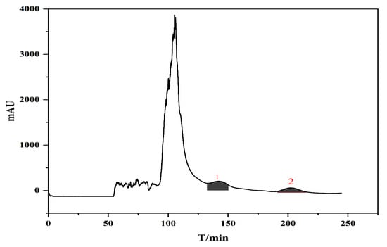 In the second stage, the target compounds screened by UF were separated. A suitable solvent system of water/acetic acid/n-butanol (2:0.02:2, v/v/v) was obtained through the screening of the K value with the 2.5 method for the separation of the active fractions under the following HSCCC conditions: a temperature of 25 °C, 900 rpm, a flow rate of 2 mL/min, and a detection wavelength of 240 nm; the rest of the operating procedures were the same as above.