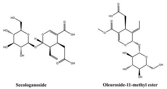 The chemical structures of the active compounds obtained by HSCCC isolation, secologanoside (compound 1, CAS: 59472-23-0) and oleuroside-11-methyl ester (compound 2, CAS: 60539-23-3), were identified by MS and NMR spectroscopy. The compound data are given below, and the structural formulas are shown in Figure 4.