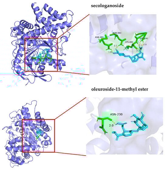 To verify the reliability of the established UF-UPLC-HSCCC method, an in vitro enzyme activity inhibition assay and a molecular docking assay (see Section 2.7) were used to evaluate the inhibitory activity of the screened active compounds against AChE. According to the literature, for samples that are difficult to dissolve in water, using 5% DMSO solution not only ensures the complete dissolution of the sample but also ensures the enzyme activity [21]. This phenomenon can be attributed to the fact that high concentrations of DMSO competitively disrupt the hydrogen bond network within the enzyme’s active site, inducing conformational changes. Furthermore, its strong hygroscopicity compromises the essential hydration shell surrounding the enzyme molecule, adversely affecting protein flexibility and catalytic efficiency. In contrast, 5% DMSO optimally modulates compound solubility to facilitate access to the active site while maintaining the stability of the enzyme–substrate complex, thereby accelerating choline release. Therefore, in this study, 5% DMSO was used to prepare the sample solution, and the experimental results showed that the IC50 values of compounds 1 and 2 were 0.76 ± 0.04 mM and 1.08 ± 0.05 mM, respectively. The interactions of potential inhibitors with AChE were simulated by molecular docking. As shown in Table 3 and Figure 5, the affinity binding energies of secologanoside and oleuroside-11-methyl ester were −6.21 and −4.52 kcal/mol, respectively. They formed six and one hydrogen bonds, respectively, with the major amino acid residues of AChE, such as SER490, LYS491, ASN483, and ASN230. The hydrogen bonds may play a key role in the enzyme catalysis mechanism. The lower binding energy of molecular docking indicates that the compounds have a strong binding effect with AChE. Meanwhile, the experimental results showed that compound 1 has a promising application in anti-AD compared to compound 2. Relevant studies have shown that the positive control compound huperzine A demonstrated a binding affinity of −8.7 kcal·mol−1 toward AChE, with specific interactions mediated through dual hydrogen bonding (His440-Ser200) and hydrophobic contacts (Phe330-Phe331) within the catalytic pocket 1011 [26]. Notably, the oleanolic acid ligand exhibited stabilizing CH-π interactions between its core scaffold and a conserved aromatic cluster comprising Phe288/290/330/331, Tyr121/334, and Trp84/279 side chains, which collectively form the peripheral anionic site adjacent to the catalytic triad [27].