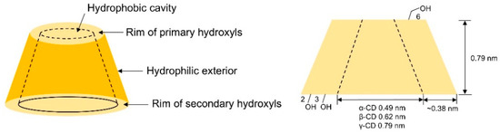| Cyclodextrin | Glucose Unit | Molecular Weight | Cavity Height (Å) | Cavity Diameter (Å) | Cavity Volume (Å3) | Specific Optical Rotation ([α]25D) | Water Solubility (g/100 mL) |